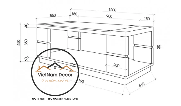 Kích thước: (D)1200 x (R)550 x (C)450 (có bản vẽ bên dưới)